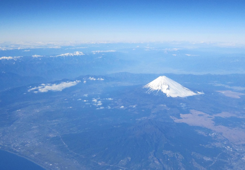羽田空港から那覇空港行きの駿河湾上空、機窓からの撮影です。 富士山の雪は、御殿場側に多い。