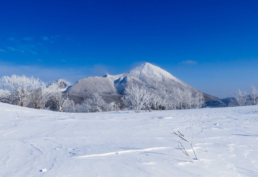 2月の会津磐梯山(1816m)です。蒼空のもと、新雪を抱いた磐梯山は、三角錐の気品のある頂を天へ向けていました。