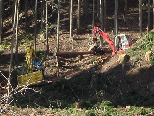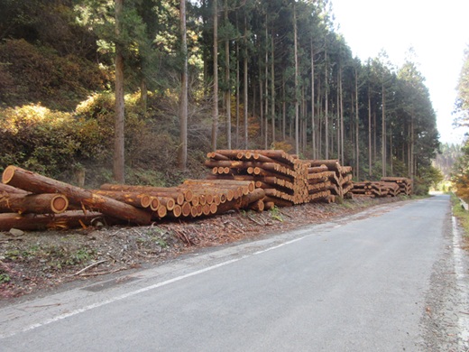 △ 茨城県の最高峰である八溝山の山麓では、随所でスギやヒノキの伐採中。 道路沿いには大きな丸太が綺麗に積み重ねられていました。