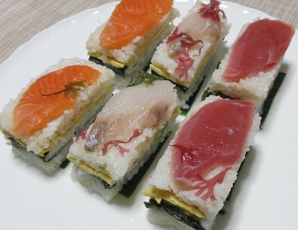 △ 月に一度ぐらいは楽しんでいる押しずし。サーモン、ヒラメ、本マグロです。海苔と卵焼きをはさみました。