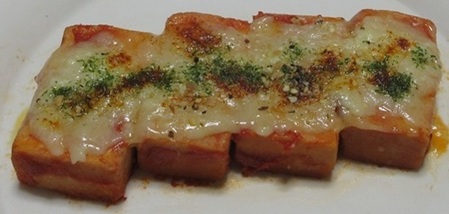 高野豆腐をトマトジュースに漬けて冷蔵庫で一晩。 それにチーズを載せて、焼きました。 味は・・??