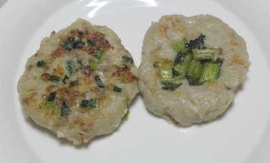 そばがきを作って、味噌ネギ(左)、野沢菜漬けを加えて焼きました。