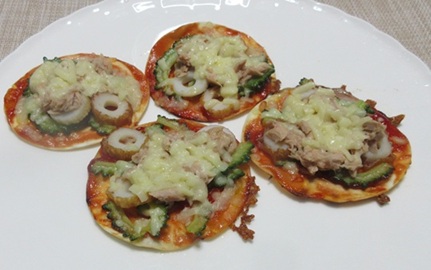 △ 餃子の皮を使ってゴーヤーのピザ。 皮にはケチャップを塗っています。ツナと竹輪入りで、白だしを振っています。