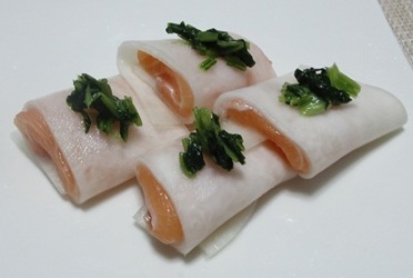 右は、千枚漬けでサーモンを巻いて、頂きました。 美味しいです。