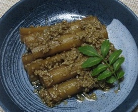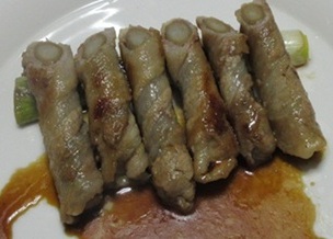 △ ゴボウの肉巻き。手間がかかります。漬けタレは醤油ベース。
