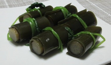 △ 昆布巻き。飾り結びはミツバ。干瓢だったら、ともに煮込めたのだが・・。